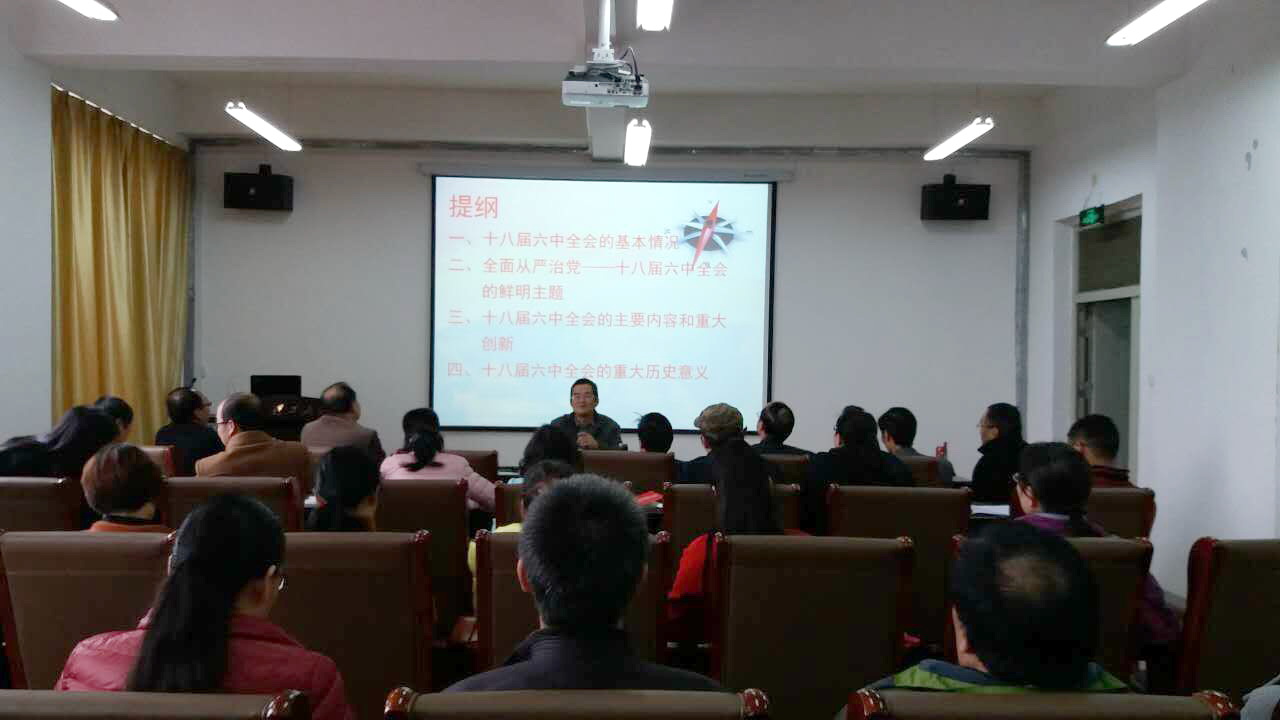 蒋军同志做了总结发言,他指出,庞桥教授的宣讲报告系统全面、内容丰富、深刻透彻,具有很强的思想性、指导性和针对性。学习宣传贯彻六中全会精神,是当前和今后一个时期的重大政治任务。广大党员应该做到:第一、以高度的政治责任感和使命感,把全会精神学习好、领会好、贯彻好、落实好,更加坚定地担起全面从严治党的政治责任,切实增强“四个意识”,发挥党员示范效应,立足本职岗位,做为人师表、服务师生的模范。第二、要把学习宣传贯彻全会精神激发出来的热情和干劲,投入到学校建设发展的实际行动中,扎实完成各项目标任务,不忘初心、继续前进,以优异成绩向“十三五”献礼,以实际行动迎接党的十九大胜利召开。