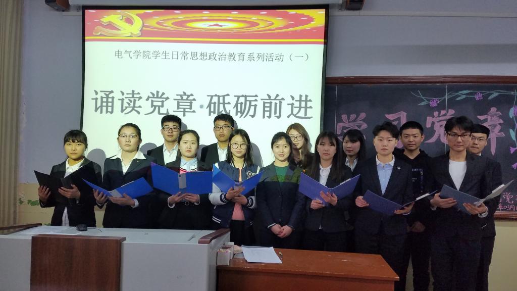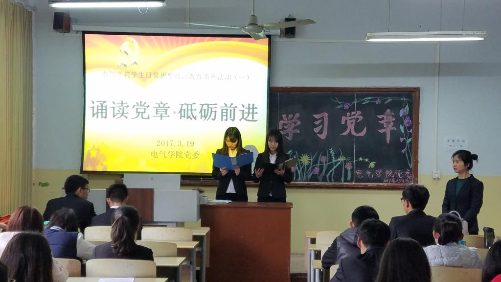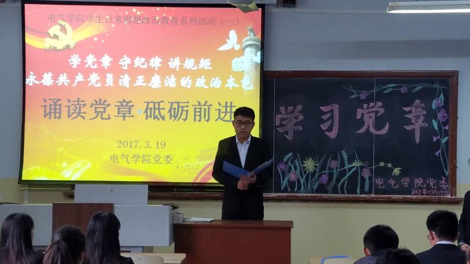 为深入推进“两学一做”学习教育,严明党的政治纪律和政治规矩,推动学生党员自觉遵守党章、贯彻党章、维护党章,3月19日下午3点,电气学院在101楼411教室开展了www.5365.com学生日常思想政治教育系列活动第1期----诵读党章·砥砺前进经典诵读会。www.5365.com学办老师、入党积极分子、团支部书记、学生党员代表共计60余人参加了本次诵读会。本次活动由电气学院辅导员纪燕老师主持召开。